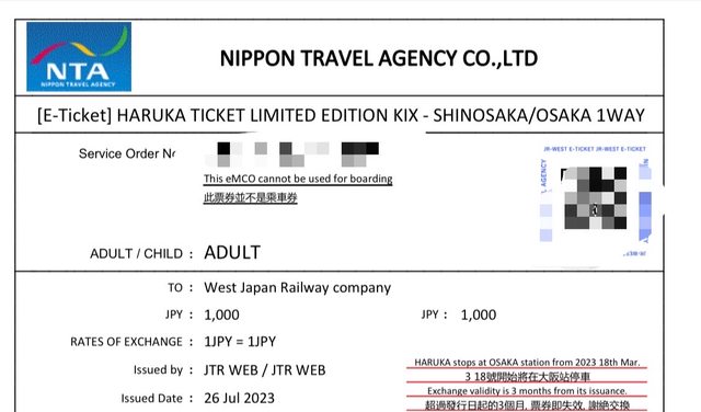 標題[讓售] HARUKA 關西機場 到 大阪/新大阪 單程車
