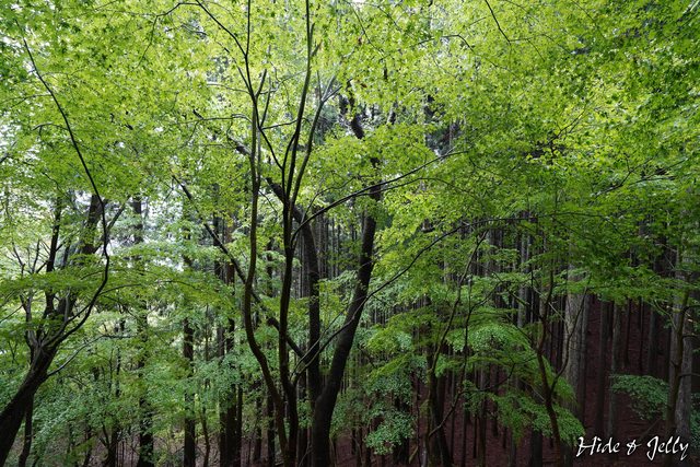 繼續下山,這裡的樣貌又跟剛剛上山的道路完全不同,直挺挺的杉木間出現了天然的山凹