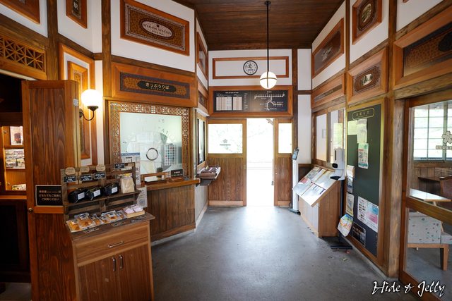 不只外觀,車站內部也是相當有味道。紅杉木色系的配置,中央的一盞燈畫龍點睛。售票