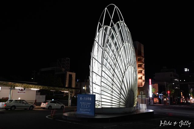 廣場另一邊則有「米子合掌像」的裝置藝術,夜晚打上燈光後,蠻像耀眼的貝殼。