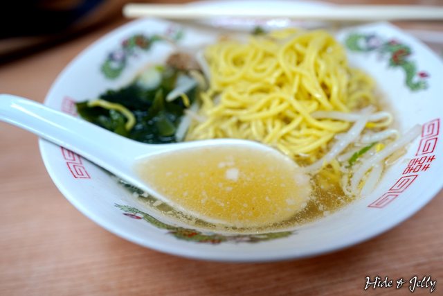 點完菜後,大約7分鐘,所點的牛骨塩味拉麵就送上來了。以中華麵配上海帶芽、豆芽菜