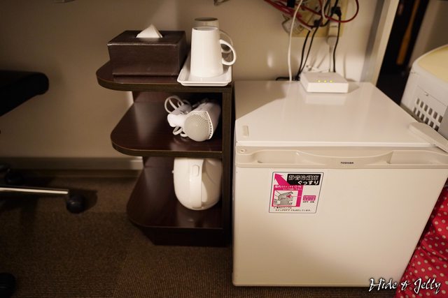 桌下有小冰箱、杯子、吹風機、快煮壺等。