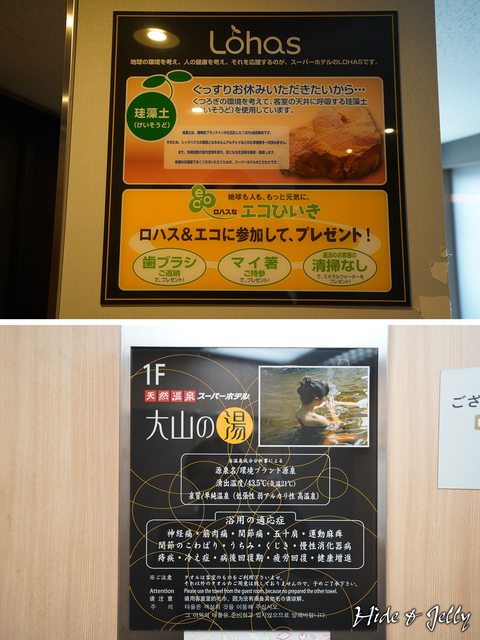 電梯中說明了飯店天花板都有使用會吸收濕氣與異味的珪藻土,還有招牌溫泉大浴場所使