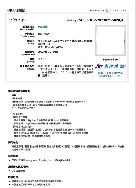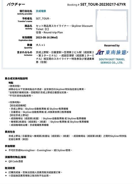 標題[讓售] Skyliner京成電鐵車票2張