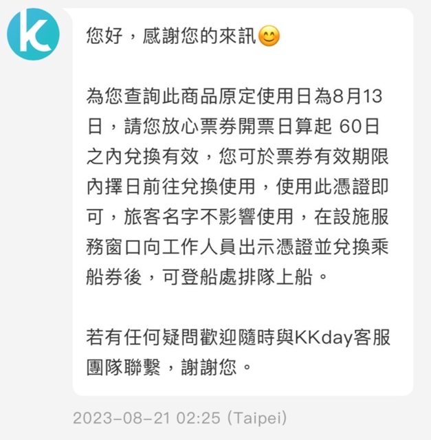 (1)原預定8/13使用,但因行程未使用到,詢問客服表示從開票日7/30算起60日之內(9/27)兌換有效,qrcode顯示逾期不影響票券使用,經兌換後1日之內有效,逾期無效。