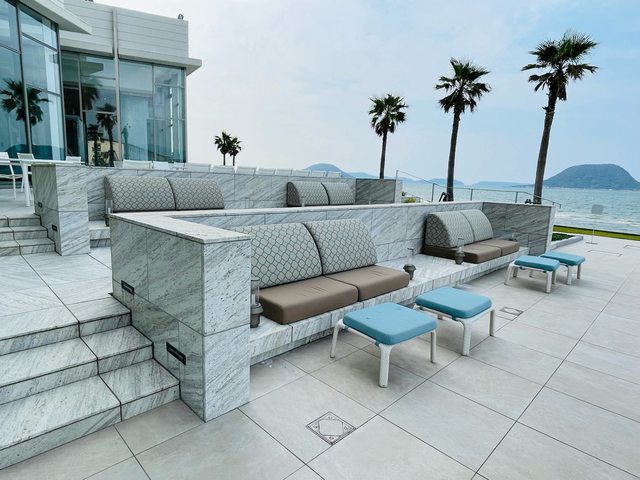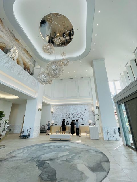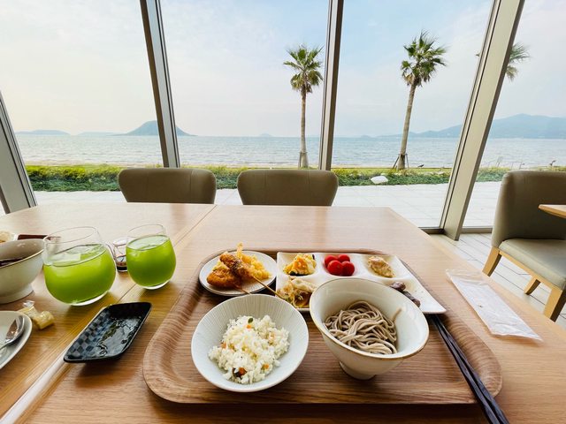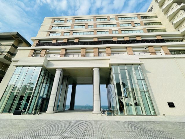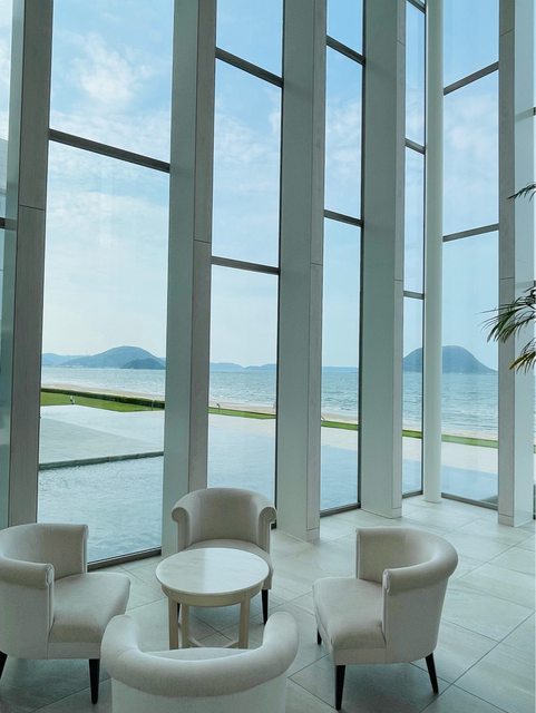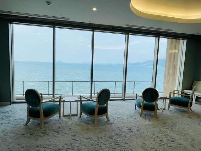 大廳挑高空間採光充足且景觀很好,唐津灣的海景在大廳就能一覽無遺。