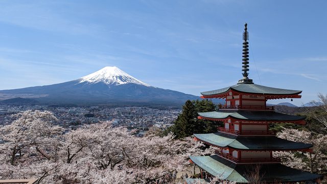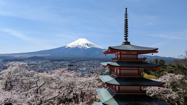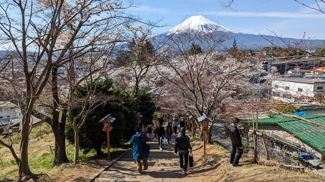走樓梯沿途賞櫻又可以看看身後的富士山 一點都不覺得累
