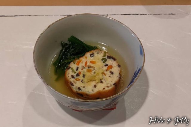 外層是豆腐皮,裡面是豆腐、蛋、野菜的燉煮料理,口感綿密有層次,豆腐皮略帶甜味,