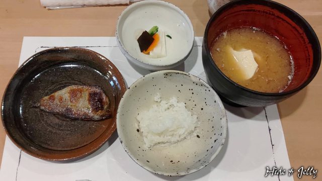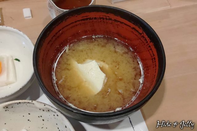 湯品則是豆腐白味噌湯,碗內一大塊經過味噌湯煮過相當入味的竹簍豆腐,入湯的竹簍豆