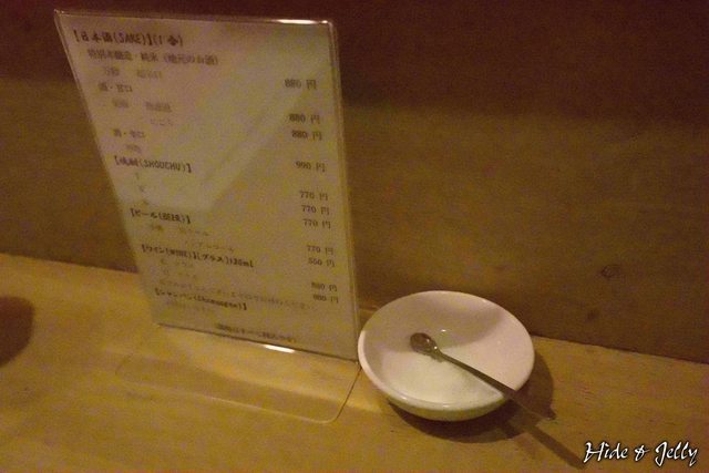 坐席上,有著調味的鹽碟,與酒精飲料菜單,不過等等我們還要攻城,所以喝茶就好,店