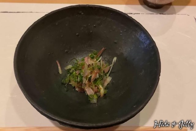 看到的家常料理,主要使用醃漬過的竹筴魚,加上柴魚片與蔥,成為一道爽口的前菜。