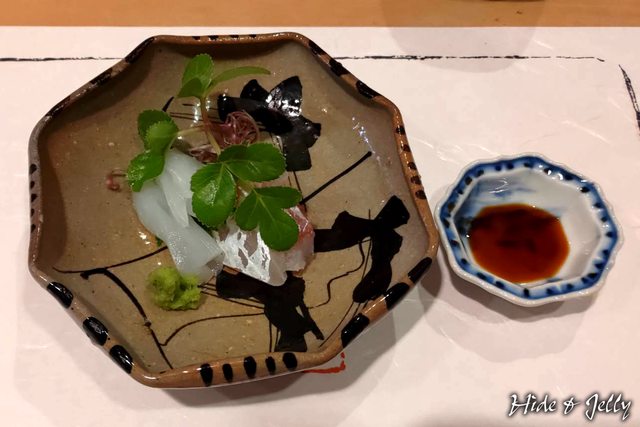 接著是呼子產花枝與竹筴魚生魚片,搭配現磨山葵,新鮮好吃,尤其是呼子花枝,又讓我