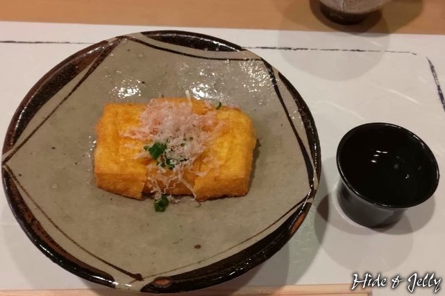 接著是日式炸豆腐,金黃色的酥脆外皮,一口咬下的喀嗤聲,隨即而來的是有一點燙口,