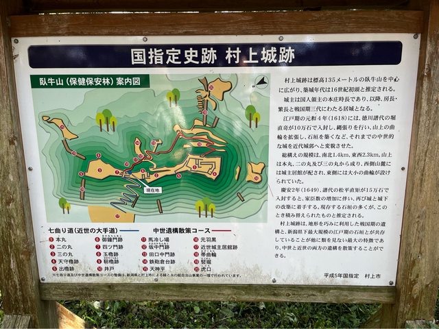 接著去村上城跡,停好腳踏車,沿著七曲道往上走。來的人並不多,我們從上去到下來,
