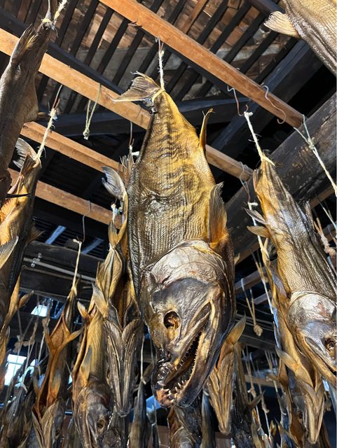 息、掛著幾條風乾的鮭魚。往後面走,出現讓人震撼的景象,滿室都是垂吊風乾中的鮭魚