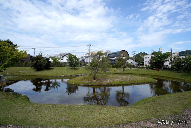 由西北側朝往東南方向的池泉庭園樣貌,後面有座半圓型屋頂的建築蠻特別的,原來是山