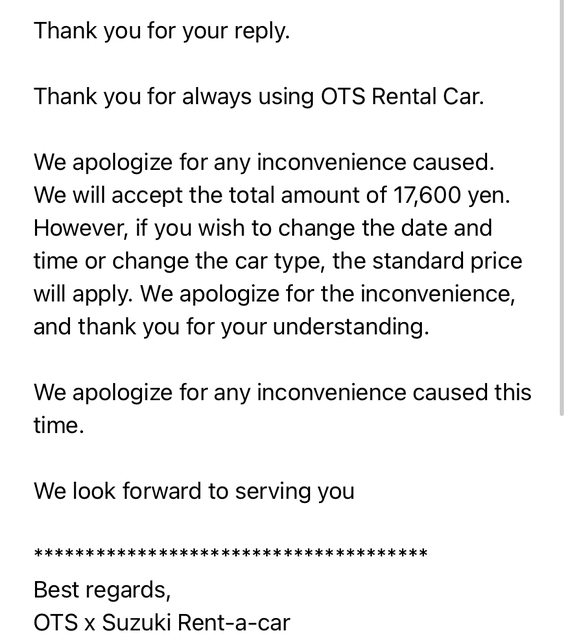 OTS回信,他們願意承擔原本的價格!!OTS真是好公司我以後租車都租他們的QQ