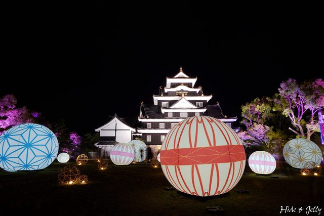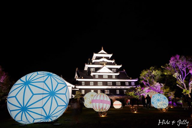 天守閣前,十數顆的彩色發光氣球,大小不同、顏色不同、花紋不同,搭配竹編球與燈光