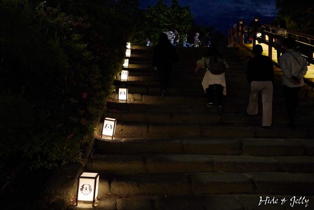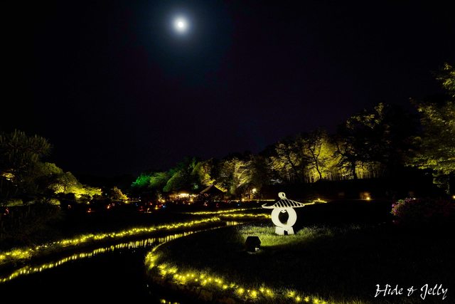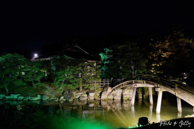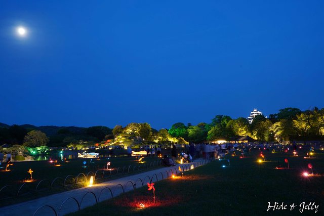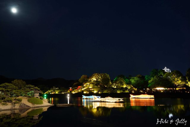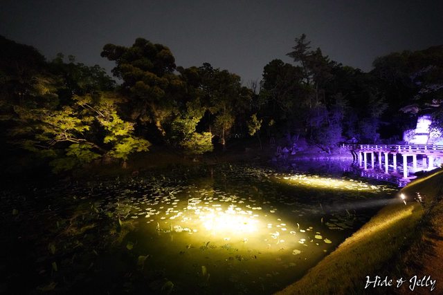 後樂園的經典畫面「中空石燈籠」,也沿著水道鋪上燈飾,搭配月圓一起享用也蠻棒的。