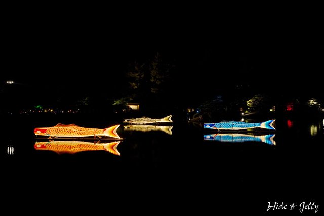 一旁的沢の池(澤之池)裡,還有三條鯉魚在游泳呢!原來橫在水面上的是發光的鯉魚旗燈