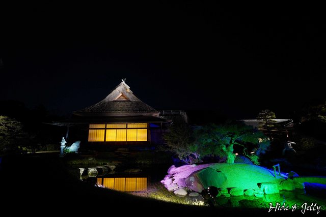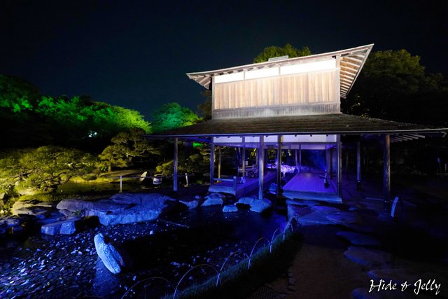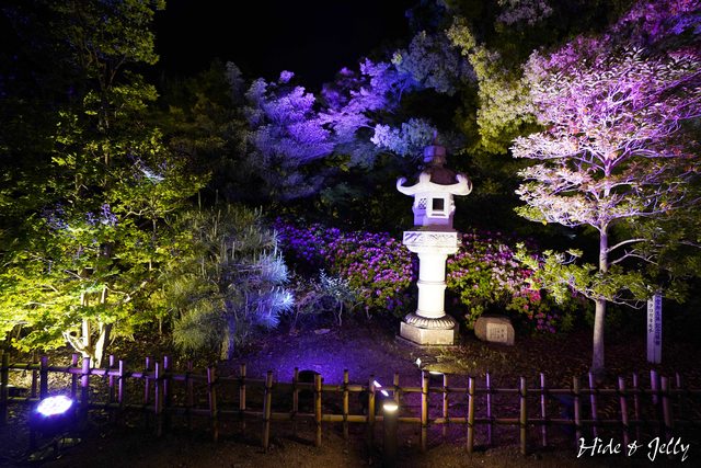 從廉池軒透出的光線倒映在水中,一旁粉色綠色藍色的光線交替,譜出幻想庭園的美。