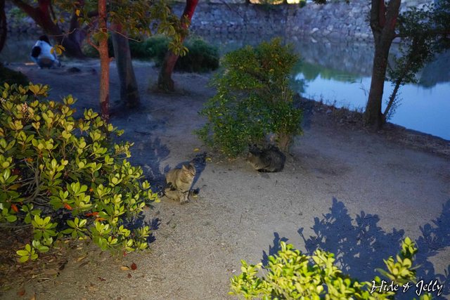 県庁前),下車後沿著「烏城みち」(烏城道)入城,在內堀旁巧遇正在餵貓的愛媽,還有