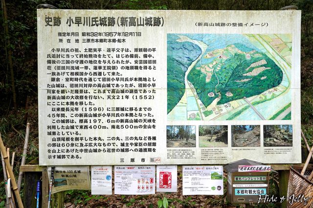 登山道口有大型的說明板,說明了新高山城簡單的歷史,城內也有60餘處削平的城郭部,