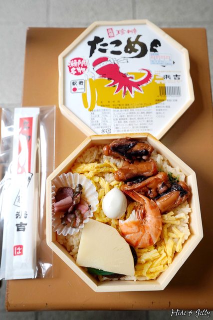 我們兩盒便當都是三原駅「浜吉」推薦的品項,首先是三原名物「たこめし」(章魚飯),