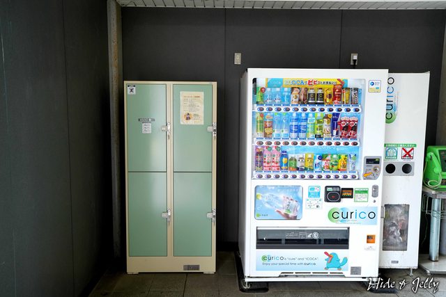 後方,自動販賣機旁有一組4格的大型行李箱置物櫃,且只需500円(別處可能要700円),