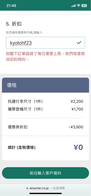 自行約行李運送 輸入折扣碼 首兩件免費 當日9點前寄放飯店 晚上6點行李到提取點 剛剛預約真的免費(有每天限量100件行李) 自己額外加了200日幣的保險費 省了好多麻煩 https://i.imgur.com/h5tA2EY.jpg