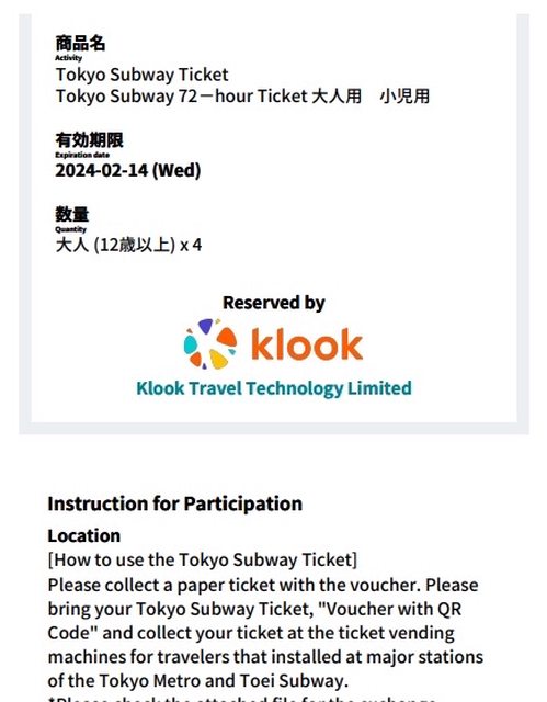 今年三月去日本時購買Klook的skyliner 來回票+東京地鐵乘車券72小時套票,四人套票