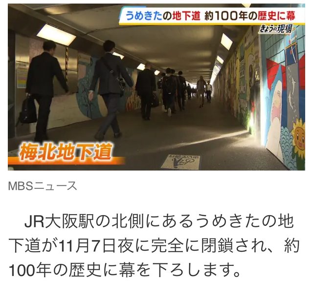 新聞原文: https://news.yahoo.co.jp/articles/ca48ad4d8b59d2ea2ae80f6fc022d12ca5d4e655?page=1 「梅北地下道」約100年の歴史に幕…グランフロントー梅田スカイビルをつなぐ道 過去には迷惑自転車問題も 壁面アート描いた人は『寂しい。本当に幸せだった』 原文太長,就不全貼了。 大家常常通往「梅田藍天大廈」的「梅北地下道」昨天正式封閉,結束100年的歷史 未來前往「梅田藍天大廈」,走地上平面即可到達 可惜前陣子去的時候,不知道地下道要關閉了,沒有辦法拍壁畫來留下紀念 ----- Sent from JPTT on my iPhone -- ※ 發信站: 批踢踢實業坊(ptt-site.org.tw), 來自: 36.228.231.105 (臺灣) ※ 文章網址: https://ptt-site.org.tw/Japan_Travel/M.1699418721.A.CF5
