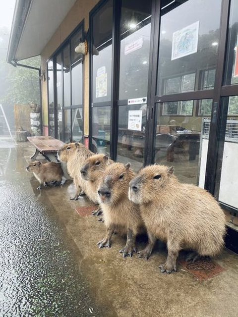 明星動物是水豚,對面是大室山,我們是當作登山纜車的雨備,結果真的下雨哈