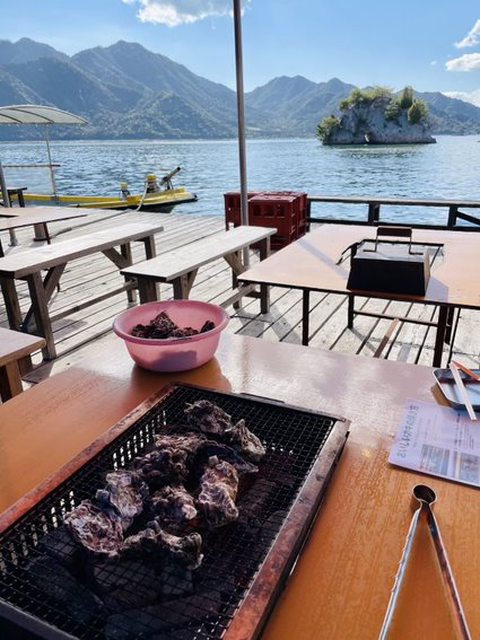 下車後先別急著去搭渡輪,推薦走路10分鐘的島田水産烤牡蠣吃到飽,吃完這頓就完全不