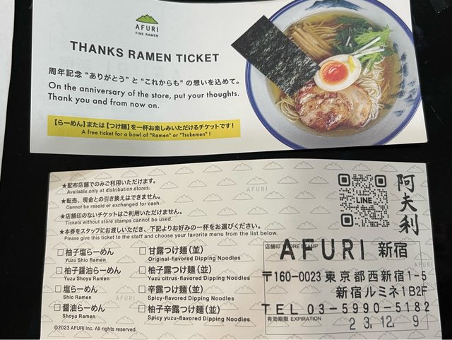 標題[已贈出] 東京新宿AFURI 阿夫利拉麵兌換券2張