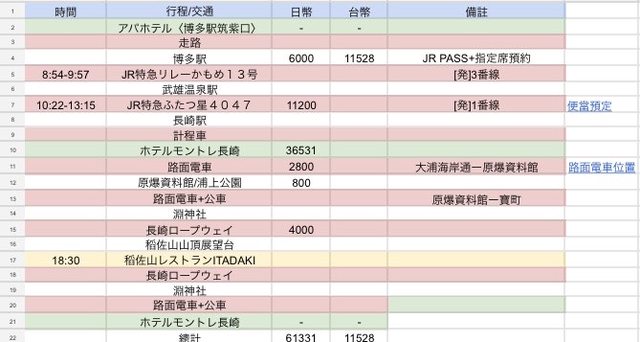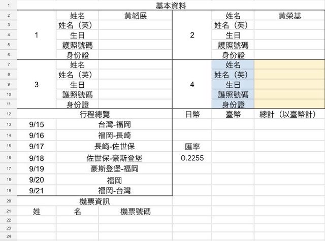我習慣在出發前把所有的身分資料、景點、交通、預算等等都放在excel內,這樣整理起