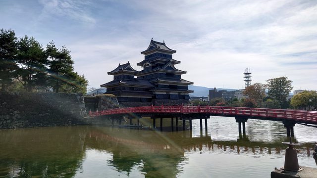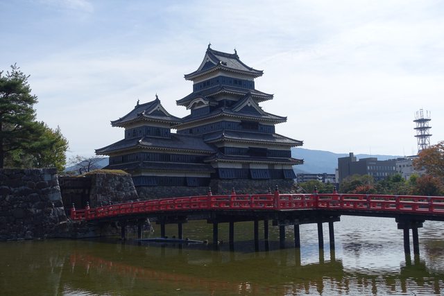 一過馬路就看到松本城經典的天守與紅色橋梁的搭配。