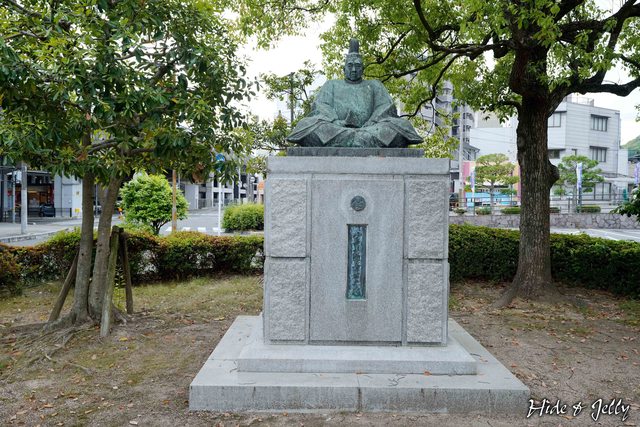 天守台西側有個小小的隆景廣場,小早川隆景的銅像每天都可以這樣望著自己最後的傑作