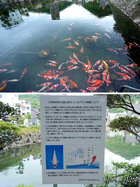啊!原來三原市內,有知名的錦鯉養殖場(不愧是廣島鯉魚),在護城河內放流了鯉魚。平