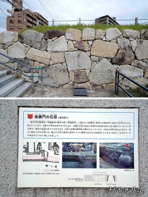 這是根據古繪圖復原的一段石垣,過去曾為後門的後藤門,現在除了使用新的石垣復原了