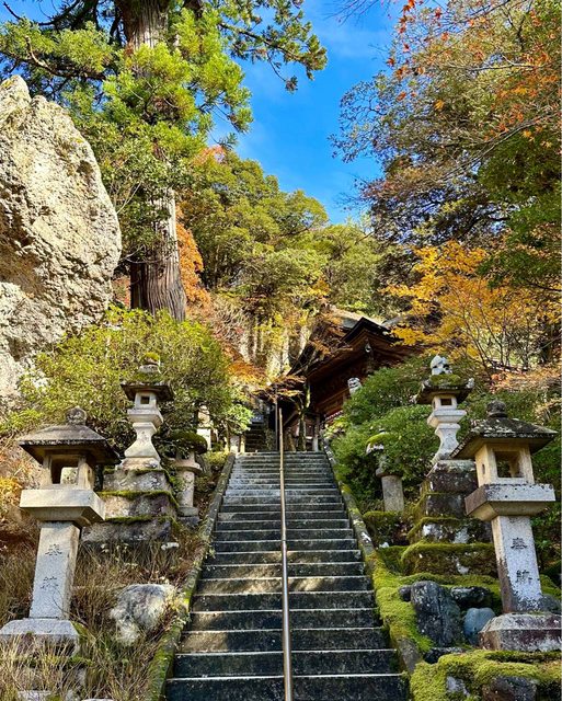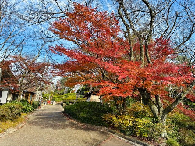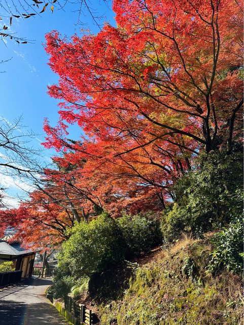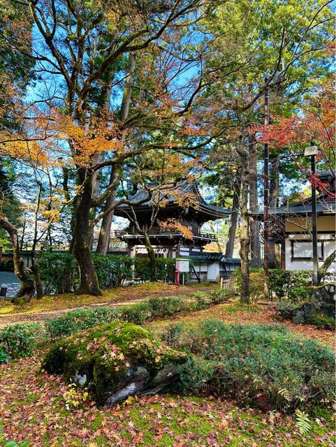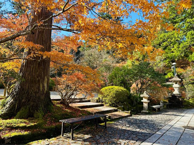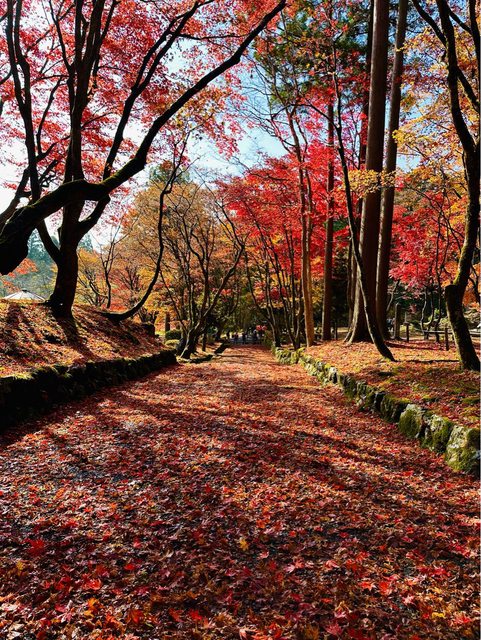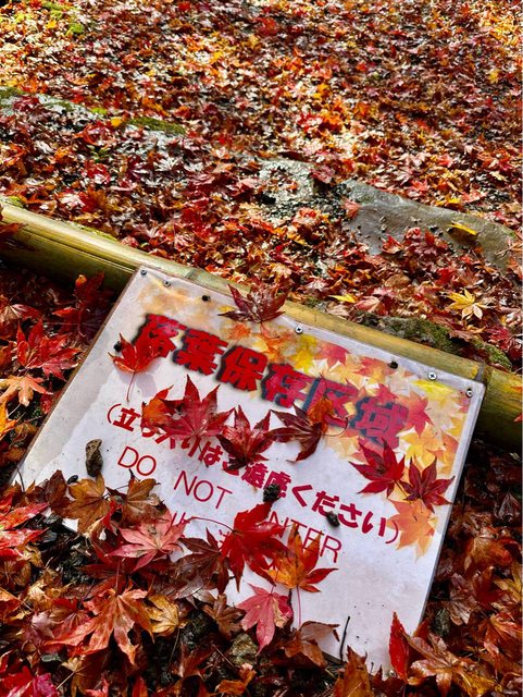 順利搭著接駁車抵達雞足寺 (接駁車和門票的費用,在台灣已先購買) 放晴的雞足寺好美 參道前後被圍了起來,註明是「落葉保存區域」 飄落的紅葉鋪滿整個地面 是我最喜歡的區域