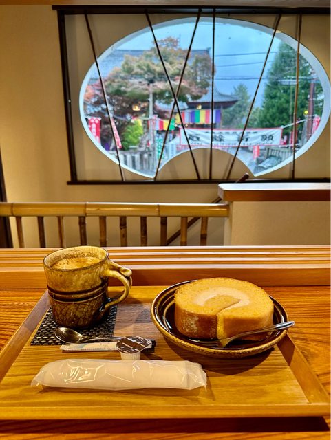 抵達木ノ本駅才08:13 離前往雞足寺的第一班接駁車還有一段空檔 走到了角屋享用早餐 座位區位在二樓 有濃厚的塌塌米香氣 鬆軟的蛋糕卷配上黑咖啡 搭上窗外景致-木之本地藏院 復古的氣氛超放鬆心情