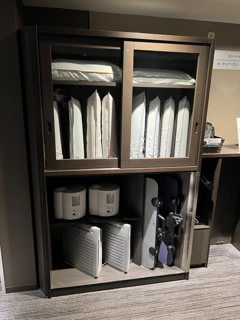 每層樓都有備品區,共有五種不同材質的枕頭,檯燈、空氣加濕器等也都可以借用。