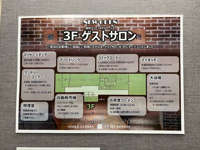 而三樓也有豐富的設施可使用。除了大浴場、蒸氣室、按摩椅,也有免費的洗衣機及烘衣