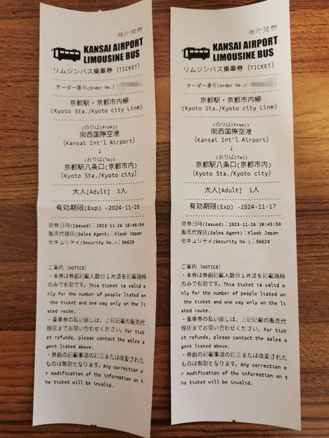 1. 讓售品項:關西機場-京都 利木津巴士單程車票3張,2024年11月16日前有效;及關西機