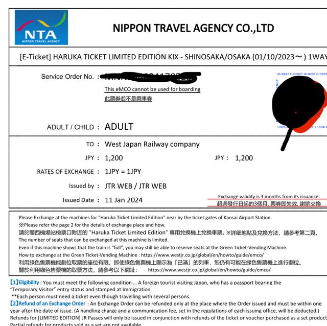 1. 讓售品項:HARUKA 關西機場 - 大阪/新大阪