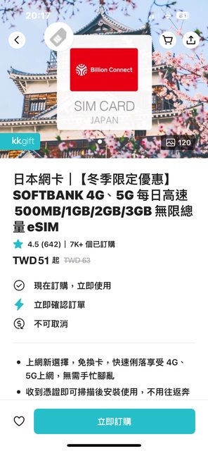 → bbbb25487 : 這張卡的官網都沒有賣無限流量了 我不知道KKDay哪來 01/21 16:45