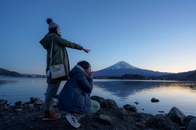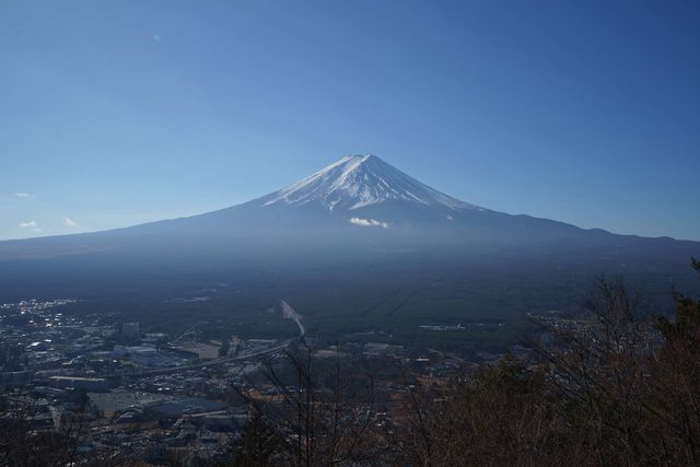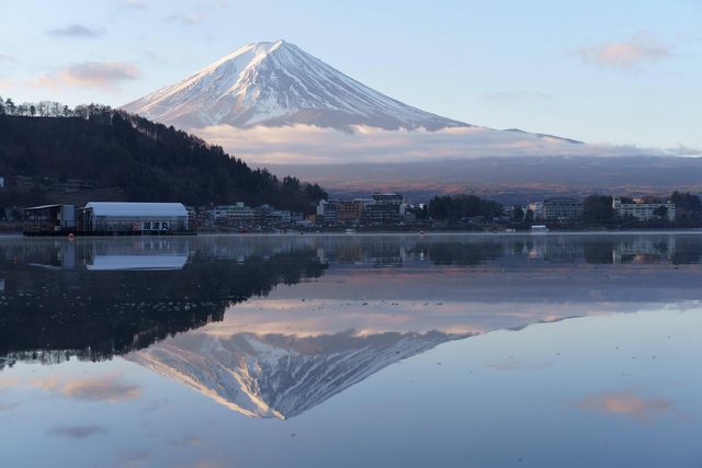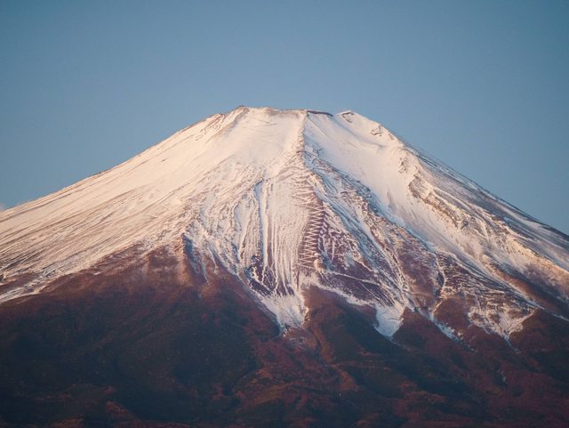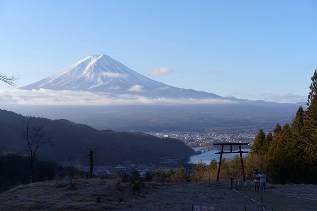今天是行程最滿最精實的一天,但我們一早就沒聽到鬧鐘睡過頭到七點左右才出門,原本以為拍不到逆富士,熱車的時候意外在飯店門口拍到最接近逆富士的照片。