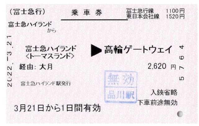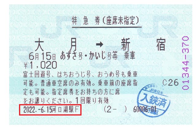 河口湖到品川的乘車券及大月到新宿的特急券