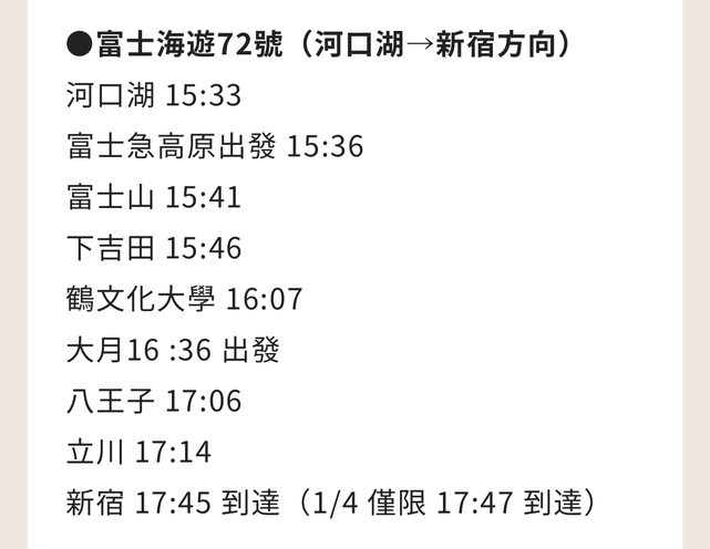 → ihl123456 : 回程你可以先劃好大月到新宿,然後去河口湖站買乘車 02/06 05:29